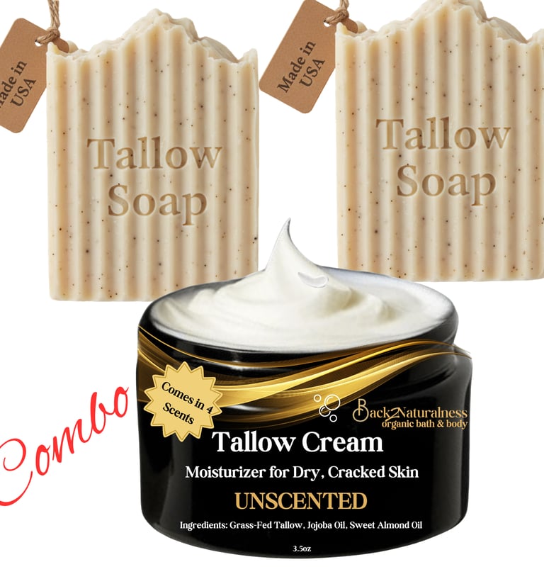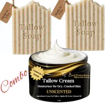 Nourishing tallow soap and moisturizer combo set includes 2 nutrient-rich bars plus one 3.5-ounce restorative tallow moisturizer jar.