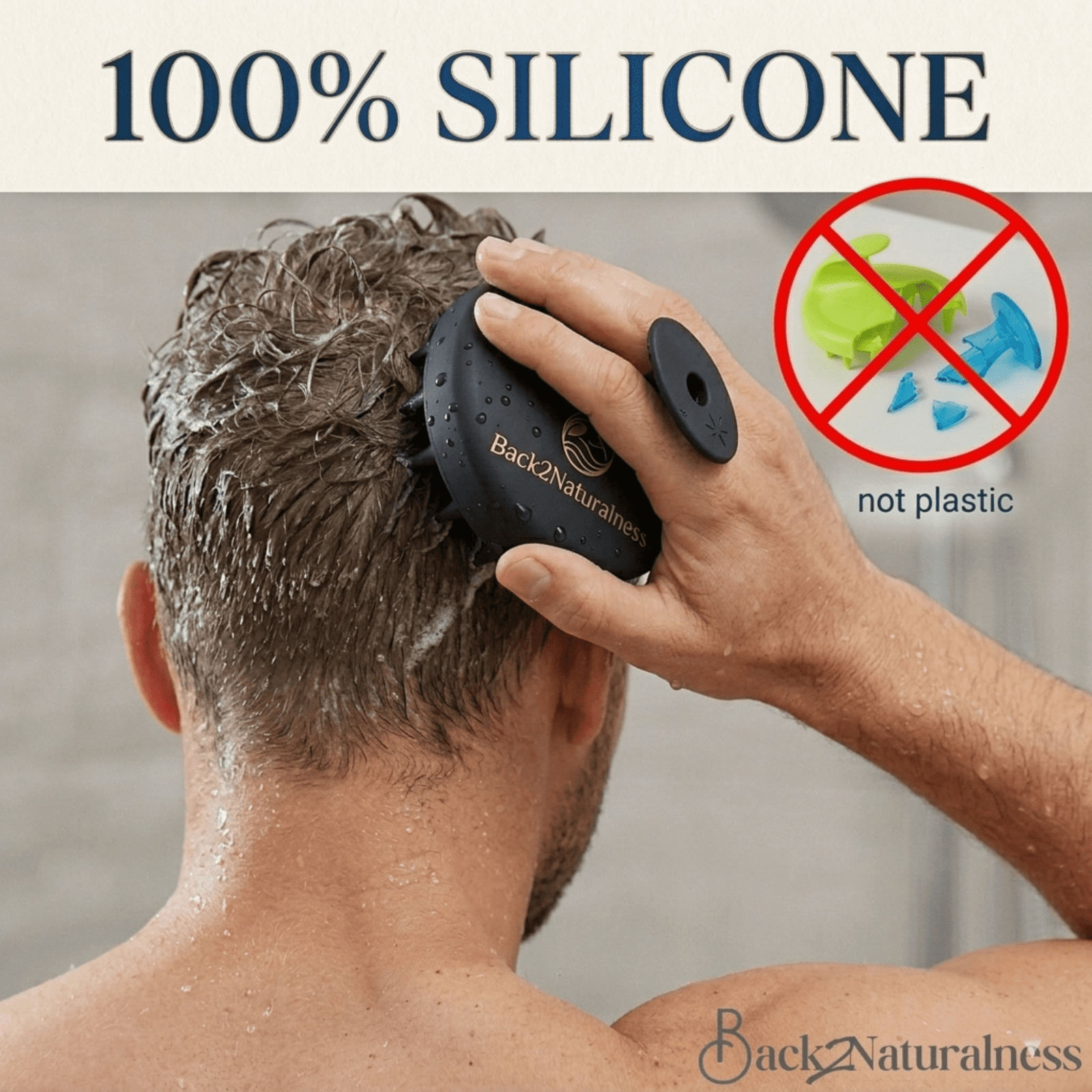 Experience the difference with the Back2Naturalness silicone scalp massager for hair growth. This 100% soft, skin-safe silicone brush gently exfoliates, stimulates blood flow, and supports thicker, healthier hair — without the microcuts, pulling, or irritation caused by cheap plastic alternatives.